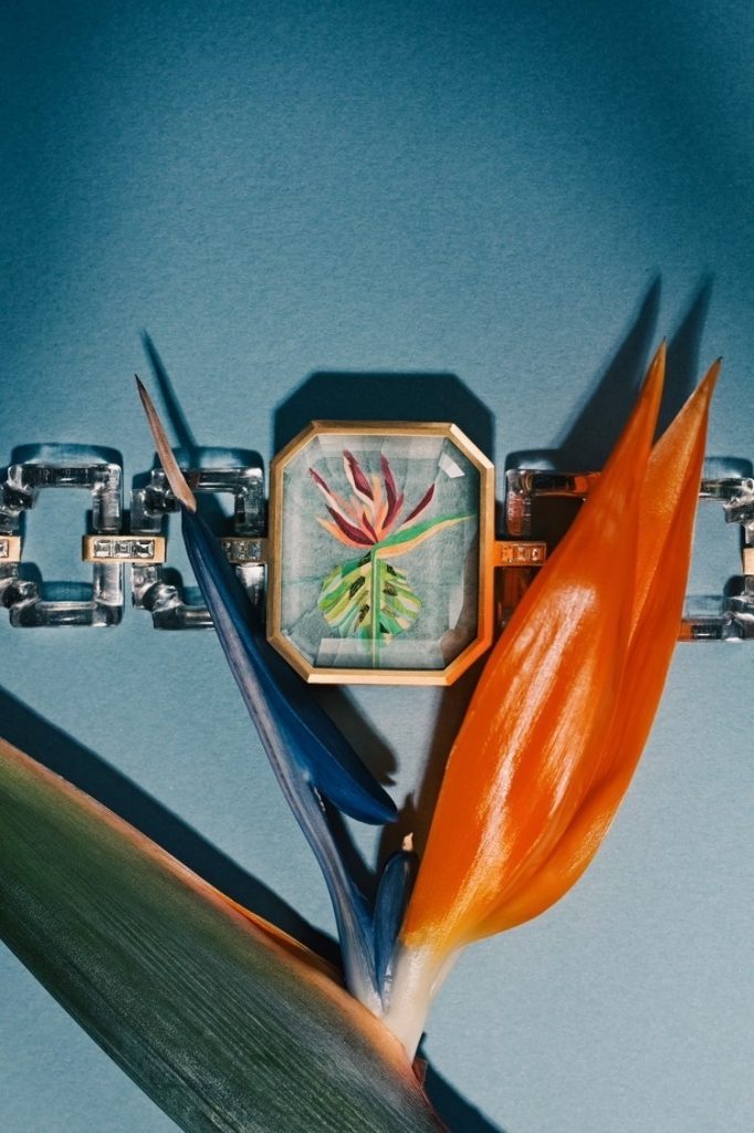 sycamore, tulip tree, pear tree, straw, parchment, leather (calf), beetle elytra Base : gold. Cristal de roche, diamonds