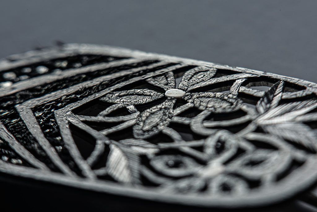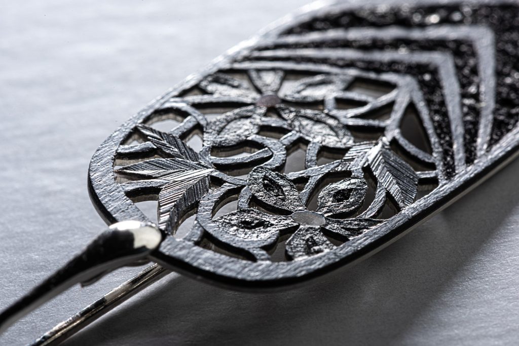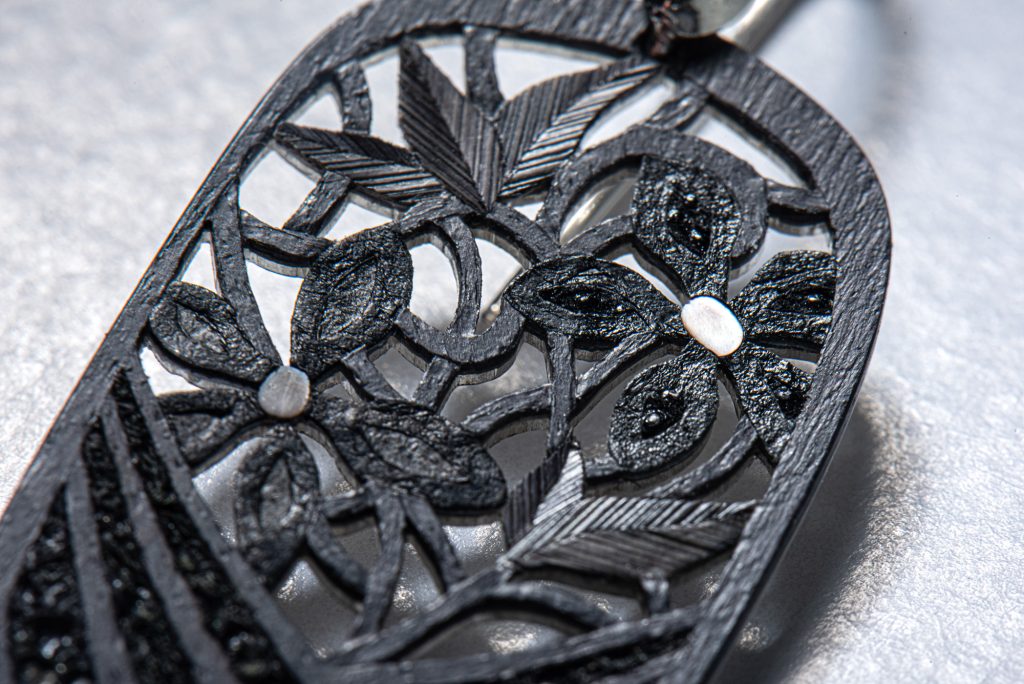 sycomore, paille, nacre Tahiti, cuirs (saumon, agneau, galuchat), parchemin, fil Miyuki.