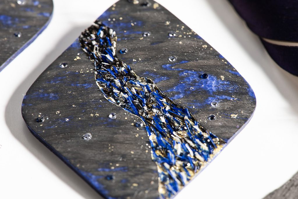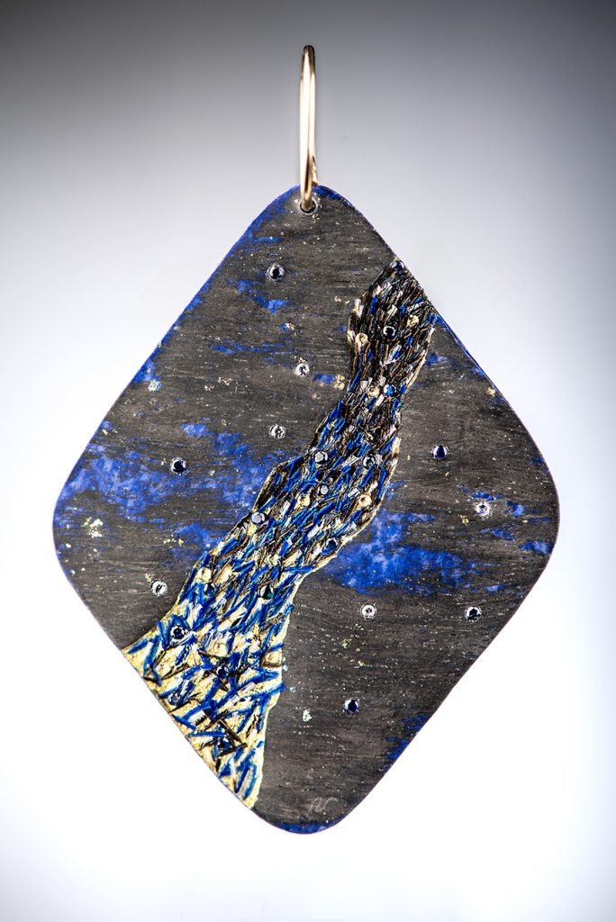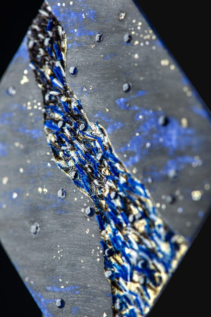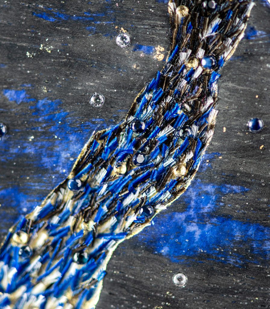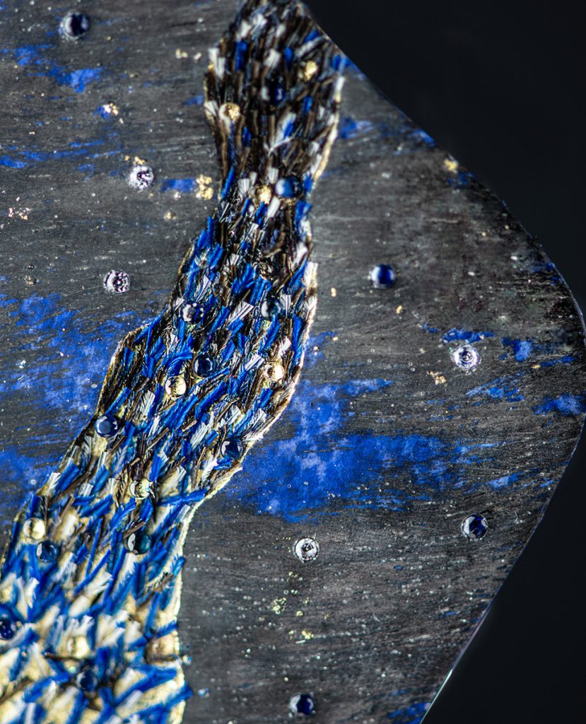 Après divers essais, voici le 1er résultat, un décor de nuit étoilée avec l’apparition de la voie lactée. La partie nuit étoilée est un mix de parchemin et placage de bois travaillé en dégradé pour avoir cette « transparence ». J’y ai ajouté des éclats de feuilles d’or et quelques pierres précieuses pour représenter les étoiles. La partie voie lactée est traitée différemment, le fond est tapissé de feuille d’or et j’ai intégré des fragments de plumes en un dégradé de couleurs associés à des pierres précieuses.
