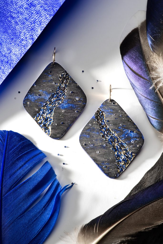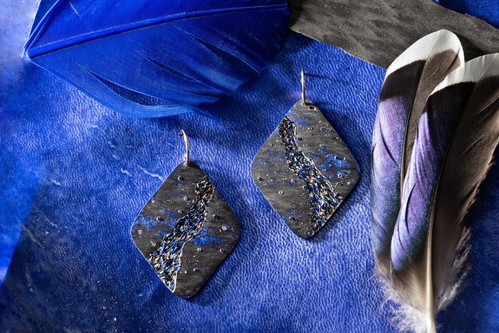 Parchemin, eucalyptus, feuille d’or, plume (canard colvert, palette d’oie), pierres (saphir, spinelle).