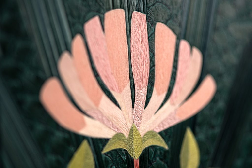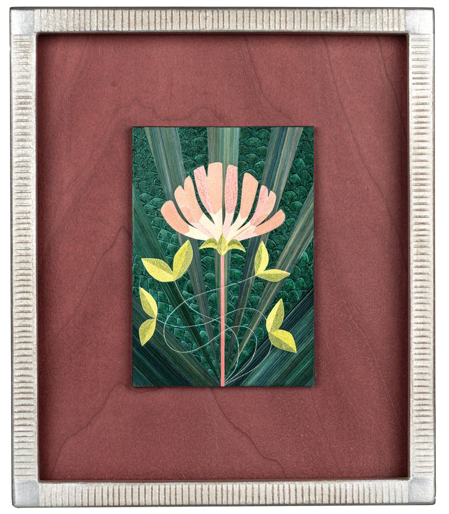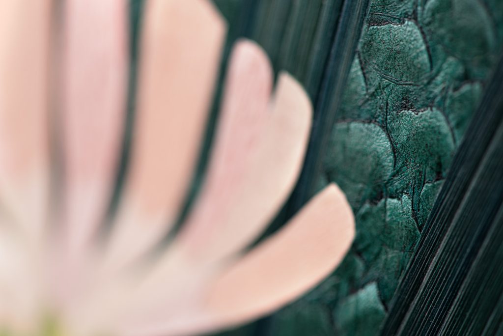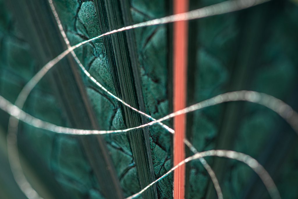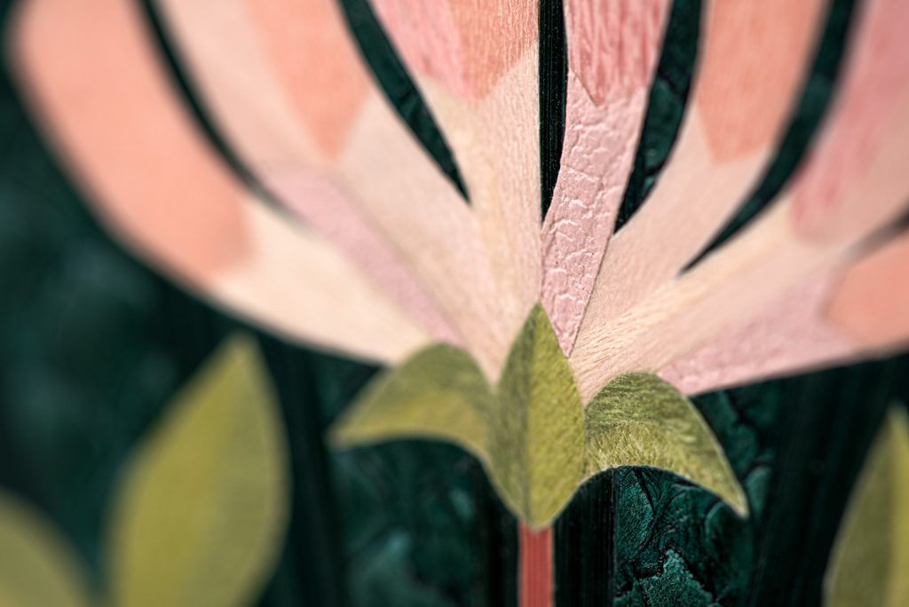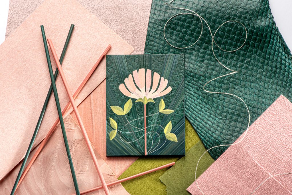 érable moucheté, frêne, tulipier, loupe de myrte, amapa, sycomore, poirier, paille, cuir (veau, saumon), fil à broder métallisé