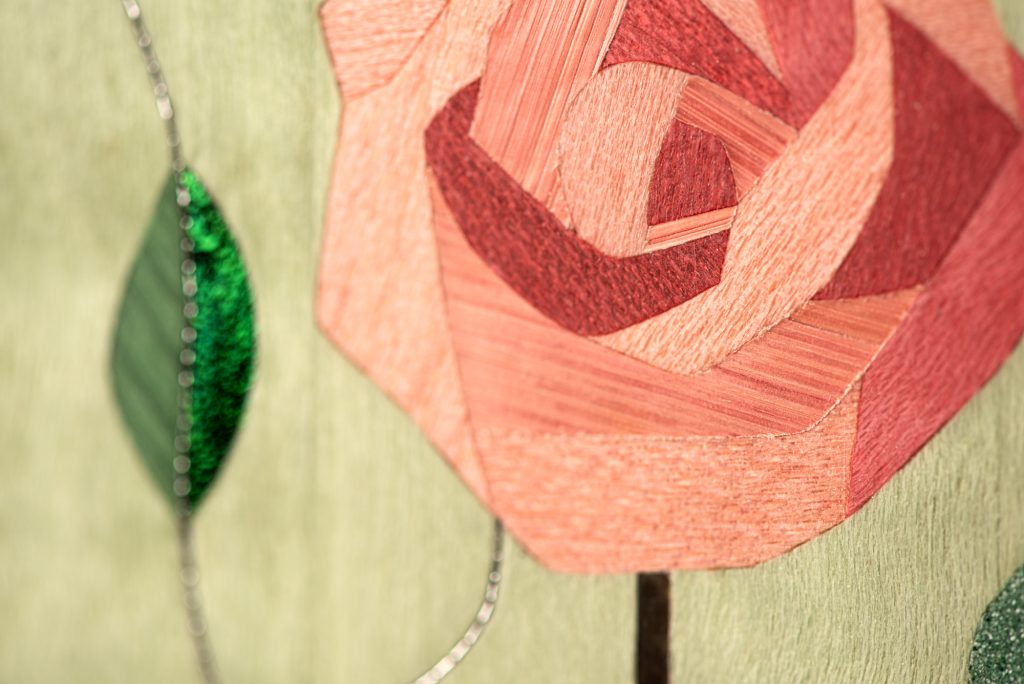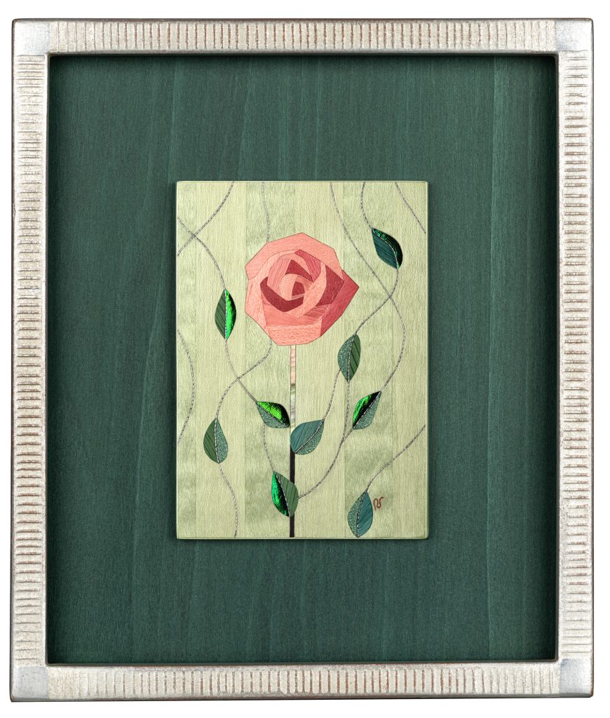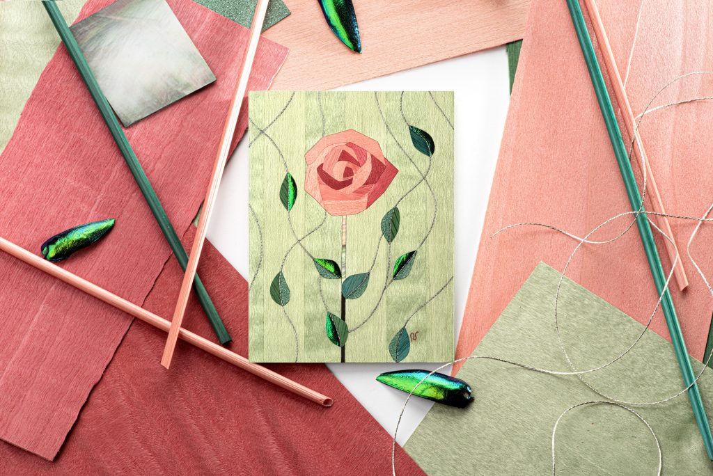 La première rose remonte aux débuts de mes recherches en marqueterie multi-matières, avec du galuchat et du laiton.