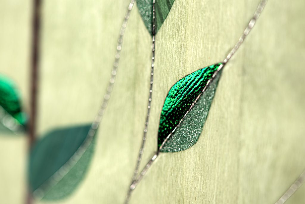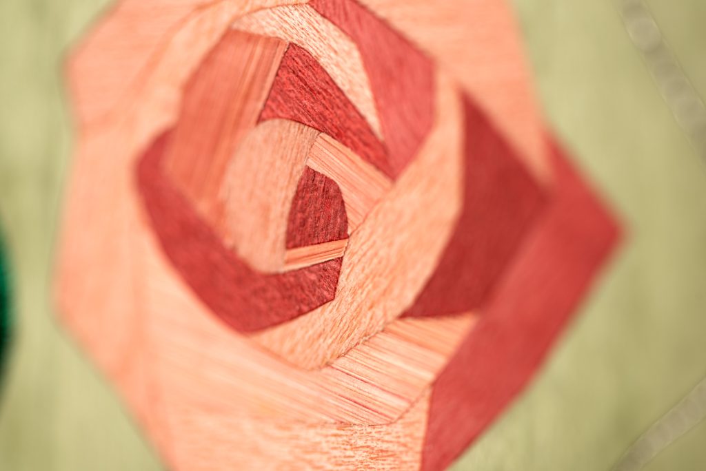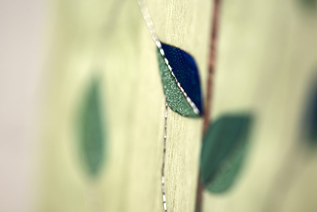 tulipier, sycomore, charme, paille, élytres de scarabée, nacre Tahiti, poudre de diamant, fil à broder métallisé.
