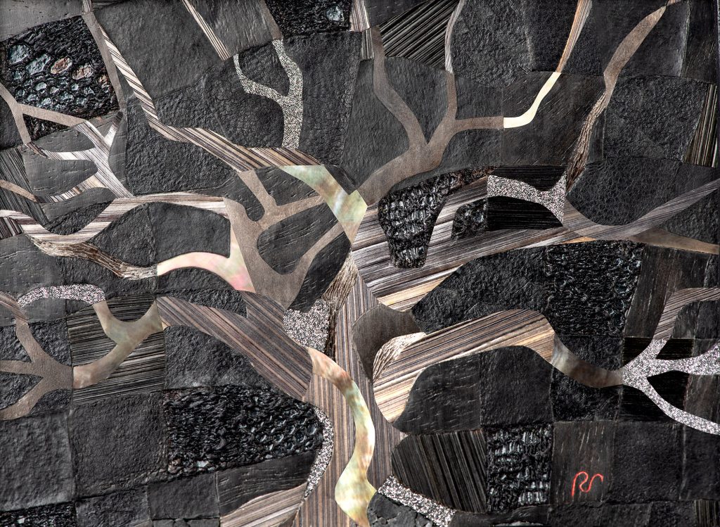 Marqueterie : poirier, loupe de noyer, nacre noire Tahiti, poudre de diamant, plume de pigeon, paille, parchemin, cuirs (saumon, agneau), ardoise, dentelle de Calais.