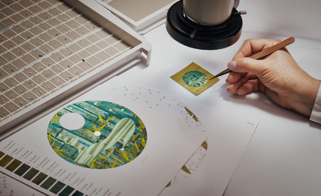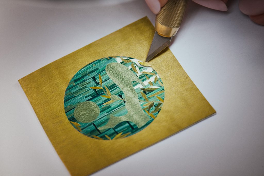 Le fond orné de motifs de bambous en marqueterie multi-matières. Le serpent, quant à lui, est réalisé en micro-sculpture et gravure par Eddy Jaquet. Enfin, l’émaillage champlevé réalisé par Vanessa Lecci apporte une richesse de couleurs et de détails.