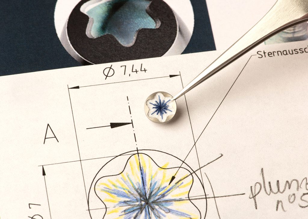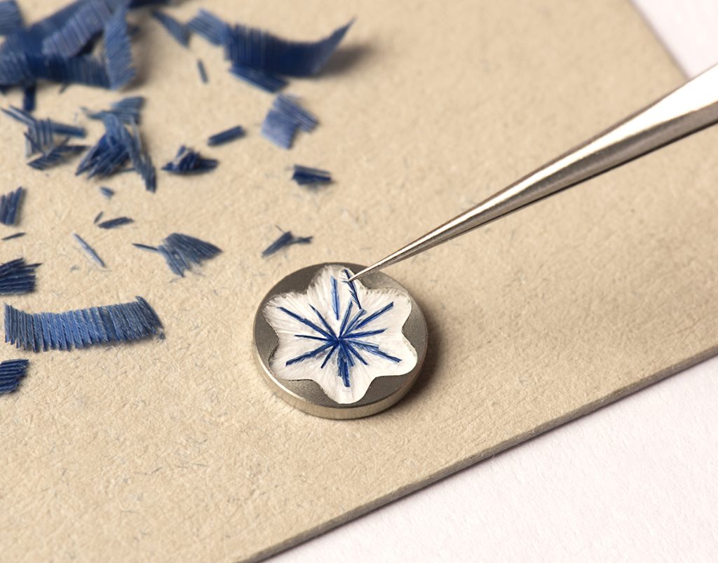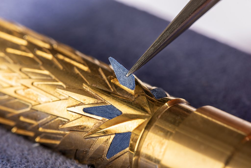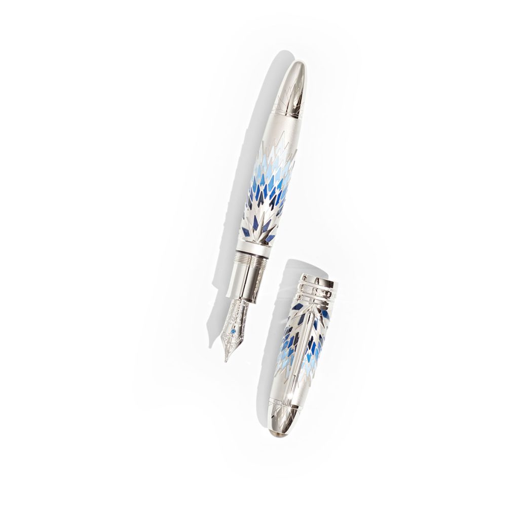 Le capuchon et le barillet sont ornés d’incrustations de laque artisanale dans les tons bleus.